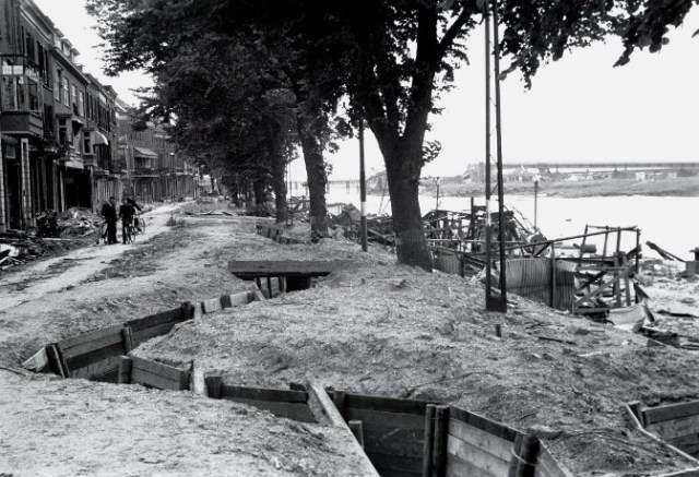 (Bron: Foto uitsnede militaire kaart bouwlocatie Arnhem: 6 N.W. Arnhem East, Holland: [overprint], 1945, © Government of Canada. Reproduced with the permission of Library and Archives Canada (2022). Library and Archives Canada/Department of National Defence fonds/e999909533-u. Foto Arnhem Rijnkade met loopgraven: Gelders Archief 1584 – 821, 1945, fotograaf Nico Kramer, CC-BY-4.0.)